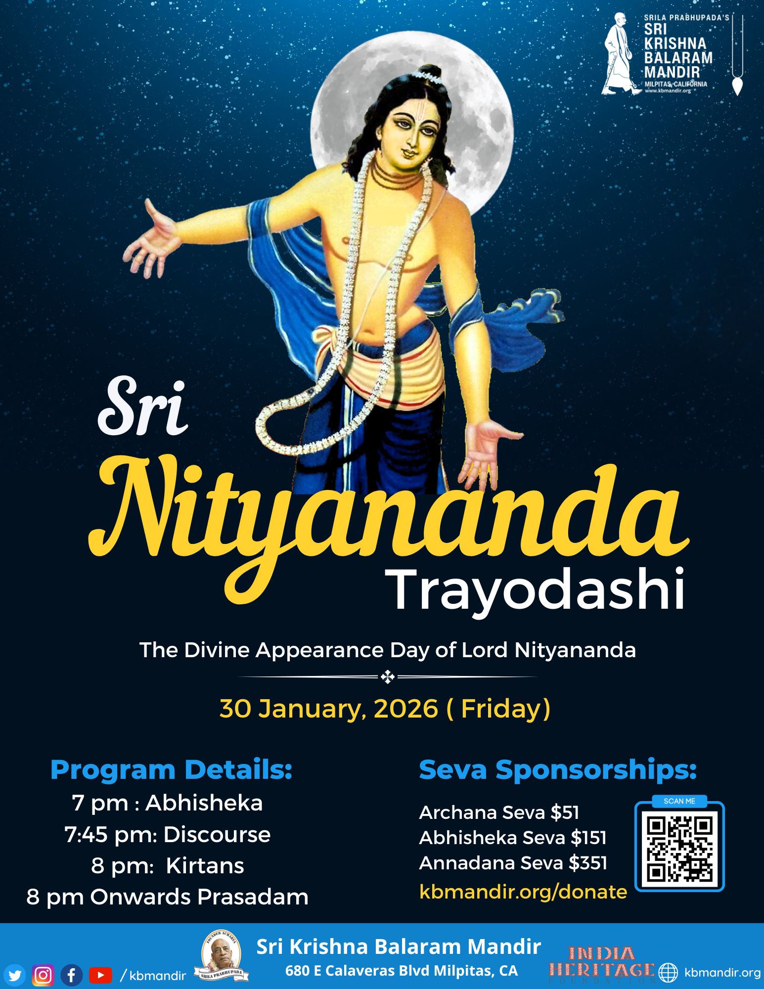 Krishna Balaram Mandir 680 E Calaveras Blvd, Milpitas, CA, United StatesJoin us for Grand Celebrations of Nityananda Trayodashi on Friday, Jan 30th from 7:00 pm onwards.