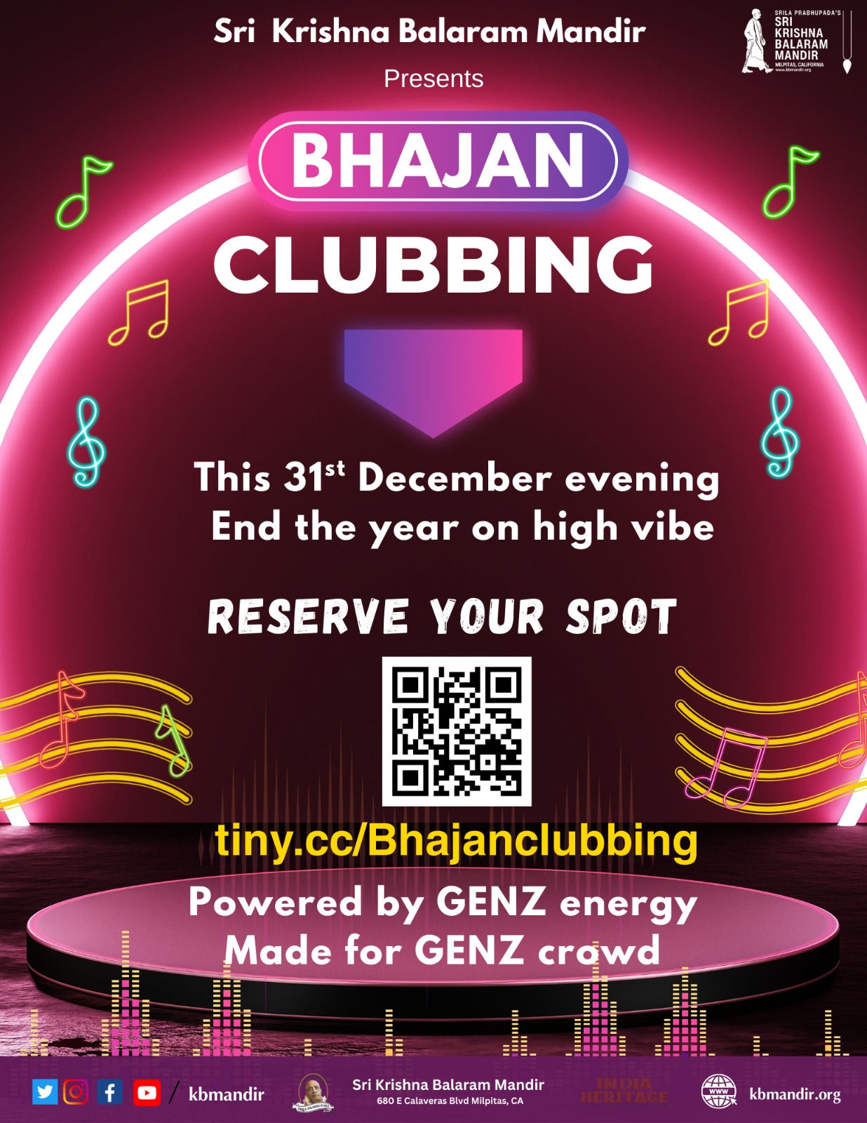 Krishna Balaram Mandir 680 E Calaveras Blvd, Milpitas, CA, United StatesThis year end, we are breaking all the usual party rules and bringing something fresh, fun, and unforgettable. Welcome to BHAJAN CLUBBING.