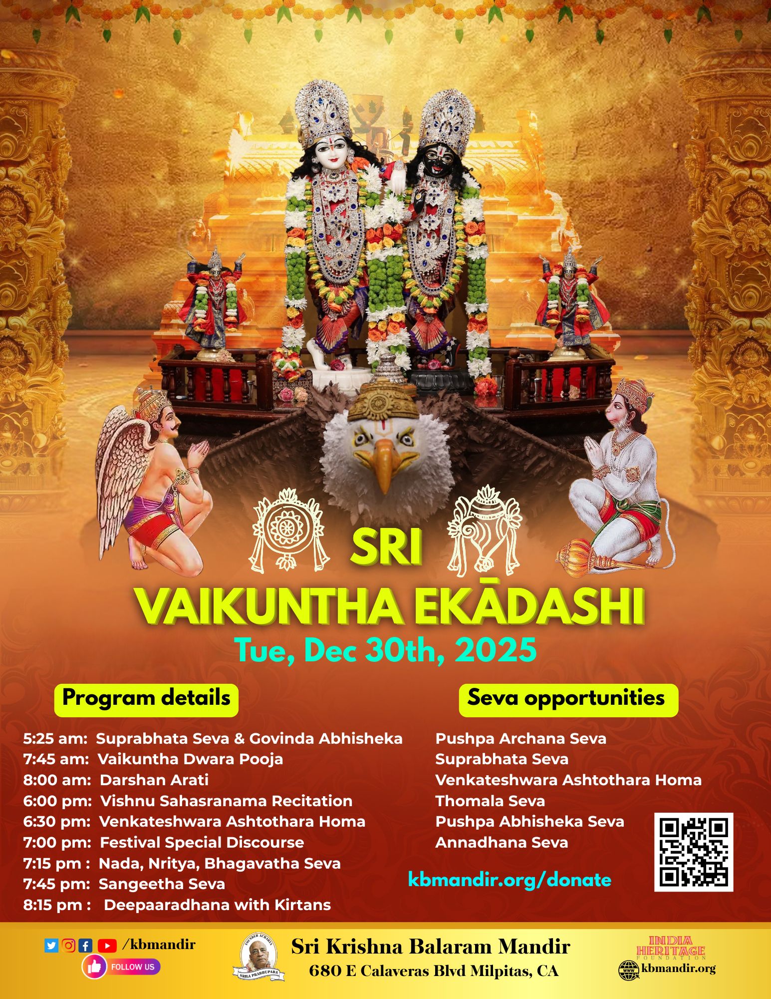 Krishna Balaram Mandir 680 E Calaveras Blvd, Milpitas, CA, United StatesPlease join us for Grand Vaikuntha Ekadasi festival celebrations on Tuesday, Dec 30th from 5:20 am on wards.